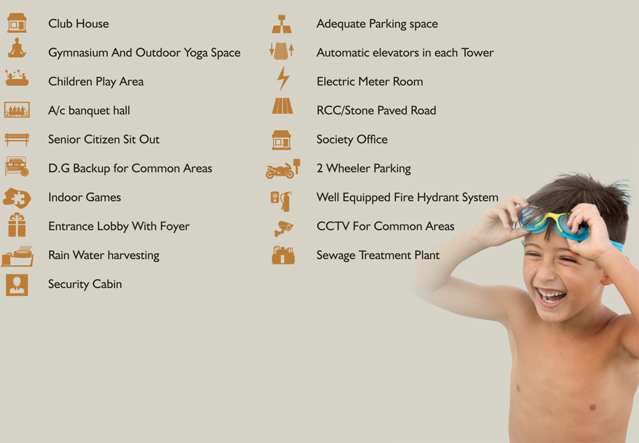 Presenting modern apartments that expand beyond four walls. This is outdoor, indoor, no-door living at its best. Built to uncompromising quality standards, each of the 6 high-rise towers are an example of contemporary living at its fi nest. Facilities include a swimming pool, and a pool deck for you to relax with family and friends. Other recreational options like a jogging track, children’s play area, sit outs and plush green lawns add up to the Community living style.